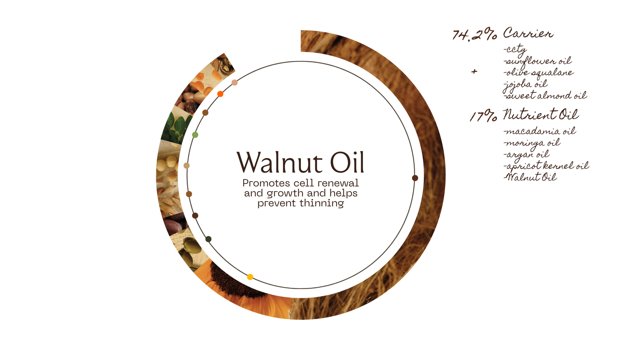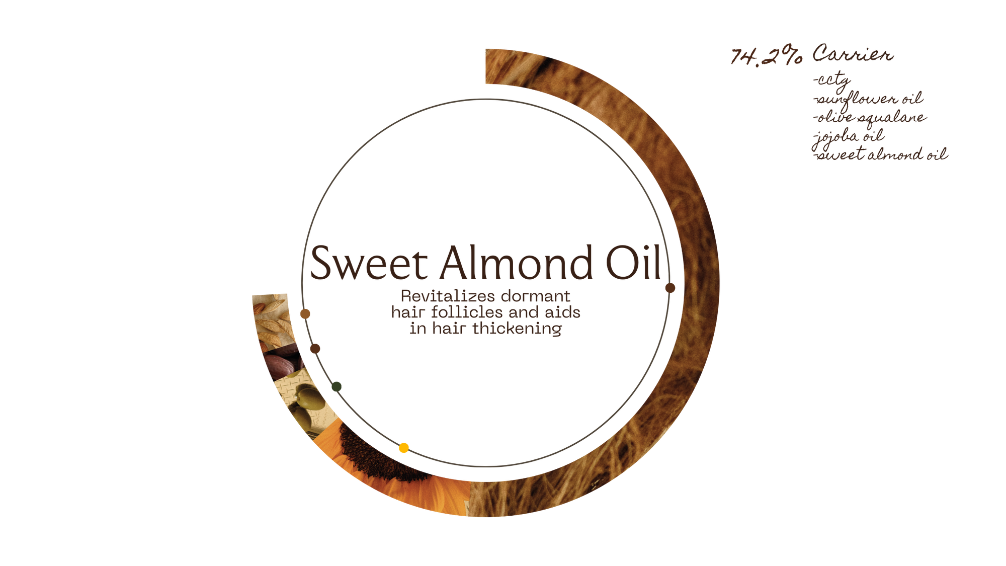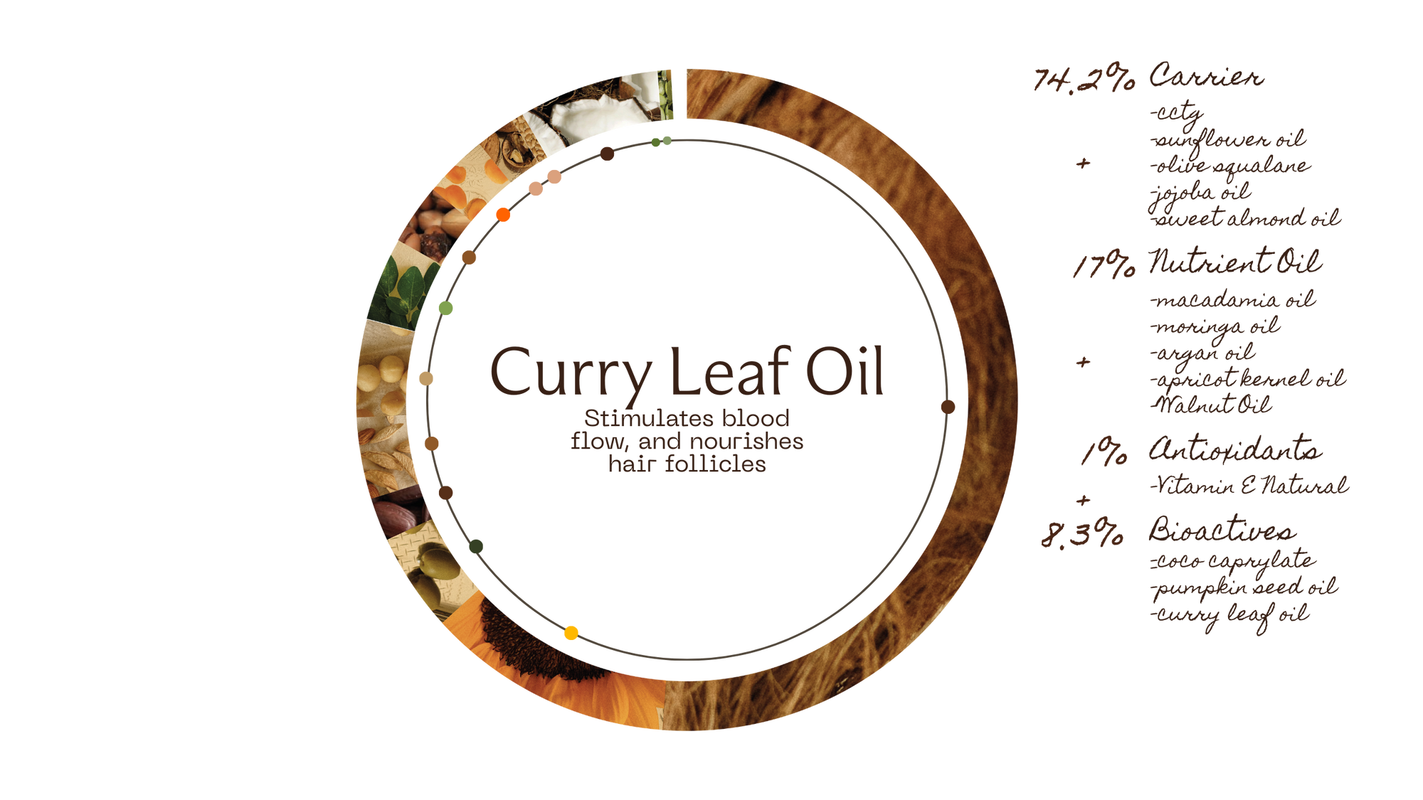 Illustration of curry leaf oil, moringa oil, walnut oil, and sweet almond oil with their respective benefits.